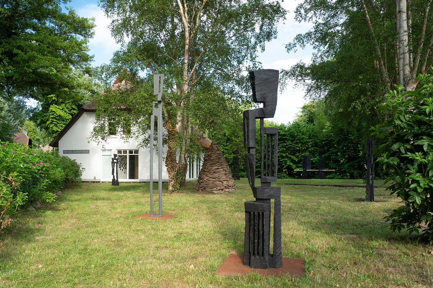 Installation von Skulpturen aus Stahl und Eichenholz im Garten vom Neuen Kunsthaus Ahrenshoop.