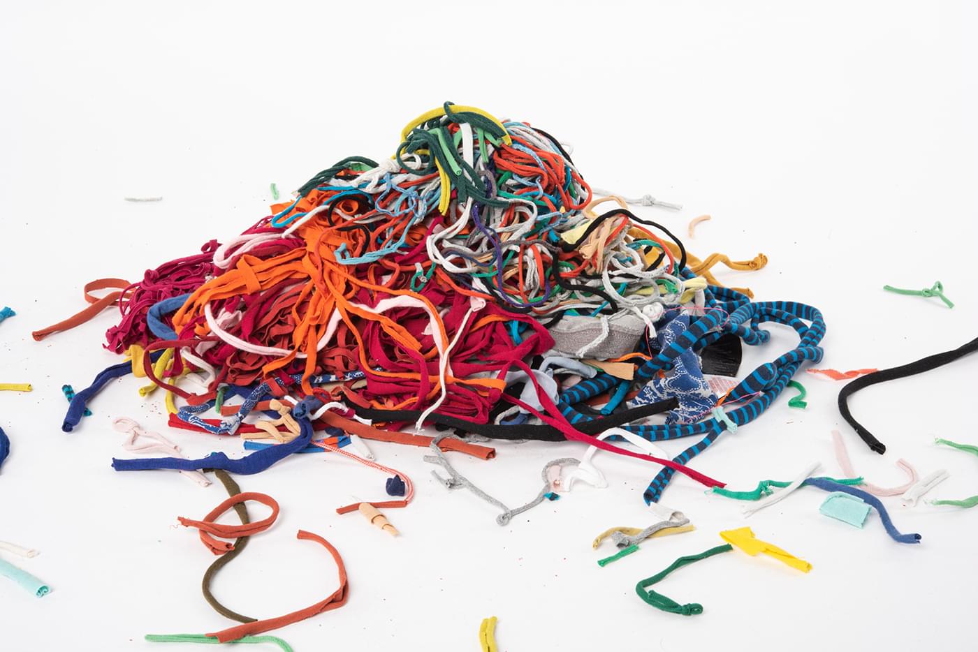 Tau Pibernat & Vera Castelijns setzen sich als Kollektiv mit der Überproduktion von Kleidung auseinander und zeigen Ergebnisse ihrer laufenden Versuchsreihe zur Herstellung verschiedener textiler Erzeugnisse aus entsorgten Kleidungsstücken.