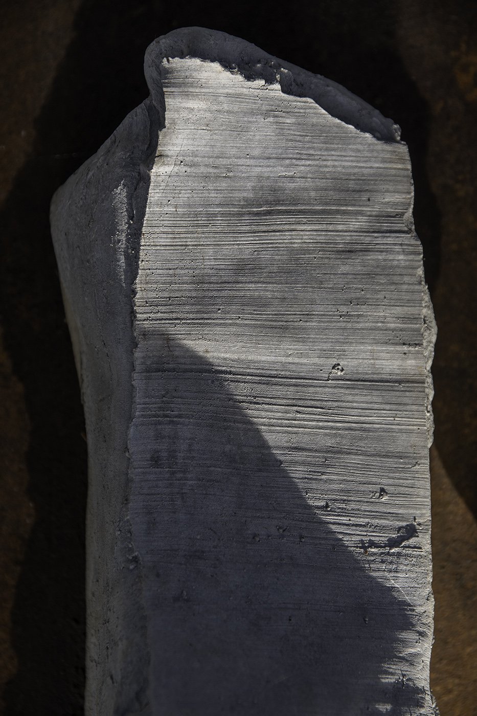 Anja Spitzer works directly with her body in fresh clay. From the very beginning, she has been fascinated by the relationship between imprint, trace, and body. As a professional dancer, she quickly learned—through the feedback of moist clay—to control pressure, angle, speed, clothing, and skin as tools in such a way that she can repeat certain sculptural basic forms and deliberately inscribe them into the clay. This provides the basis for compositional work and for the possibility of working as a sculptor in much the same way as a choreographer: she places movement. To this end, she builds strictly geometric starting blocks from clay. Through the chosen basic movement (for example, turning on the heel) and its specific force profile, the clay blocks begin to deform, to shift, to crack—recording this type of movement process within themselves.