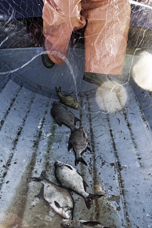 Iwona Knorr addresses the dramatic changes in coastal fishing through her photographic works. Large-format photographs document the uncertainties faced by fishermen as professional challenges; a floating photo installation presented on fragile bamboo rods highlights existential threats. These works connect the societal dimension of sustainability with the aesthetics of fragility and transience.
